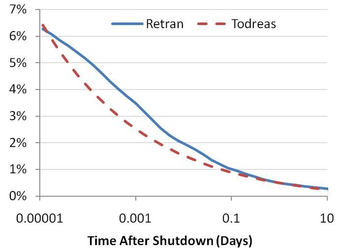 | Keywords: Decay heat illustration.PNG en Graph of Decay heat as fraction of full power from a SCRAMed operating power reactor Two models are displayed in the graph one being Retran which uses a 11 group exponential decay the other being Todreas and Kazimi from published work in 1990 which was adapted from previous empirical correlations The Retran model inputs no assumptions of operating history and the Todreas model requires the operating time before shutdown which was assumed to be 2 years for this application own Theanphibian 2011-03-13 <gallery>Image Decay heat illustration2 PNG Horizontal axis relabeled</gallery> Reference information Todreas and Kazimi Nuclear Systems Volume I Thermal Hydraulic Fundamentals http //www nuceng ca/papers/decayhe1b pdf <math>\frac P P_0 0 066 \left \left T-T_s -0 2 \right -T -0 2 \right</math> Retran 11 group model http //www exitech com/models/core_neutronics htm <math>\frac P P_0 \sum_ i 1 11 P_i e -\lambda t </math> Cc-zero Nuclear power schemas and diagrams |