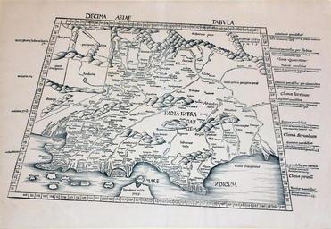 | Keywords: Decima Asiae Tabula.jpg en A slanted photograph of a copy of the 10th Asian Map Decima Asiae Tabula depicting India within the Ganges India intra Gangem from the Strasbourg Ptolemy apparently using a map cut by Johann the Blockcutter Johannes Schnitzer de Armssheim as it displays his characteristic reversed N 1513 http //pictures abebooks com/ARADERNYC/19590091986 jpg Abe Books Ptolemy other versions PD-old-70-1923 1513 maps Strasbourg Ptolemy Maps in Latin Johann the Blockcutter Ptolemy's 10th Asian Map 1513 |
