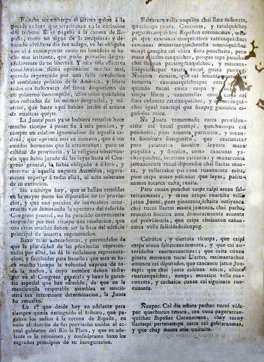 Keywords: Declaración de igualdad a los indígenas del Río de la Plata 02.jpg es Declaración de igualdad a los indígenas por parte de la Junta Grande las Provincias Unidas del Río de la Plata en 1811 El documento está redactado en español y quechua 1811 Archivo General de la Nación Argentina Junta de Gobierno de las Provincias Unidas del Río de la Plata other versions Custom license marker 2015 09 19 PD-old-100 1811 in Argentina 1811 documents Colonial history of Argentina United Provinces of Río de la Plata Quechuan languages Indigenous peoples of Argentina Uploaded with UploadWizard |