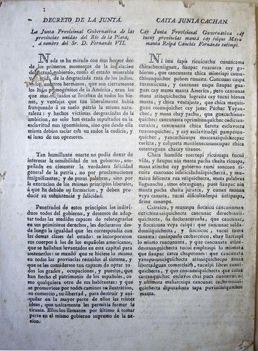 | Keywords: Declaración de igualdad a los indígenas del Río de la Plata 01.jpg es Declaración de igualdad a los indígenas por parte de la Junta Grande las Provincias Unidas del Río de la Plata en 1811 El documento está redactado en español y quechua 1811 Archivo General de la Nación Argentina Junta de Gobierno de las Provincias Unidas del Río de la Plata other versions Custom license marker 2015 09 19 PD-old-100 Uploaded with UploadWizard 1811 in Argentina 1811 documents Colonial history of Argentina United Provinces of Río de la Plata Quechuan languages Indigenous peoples of Argentina |