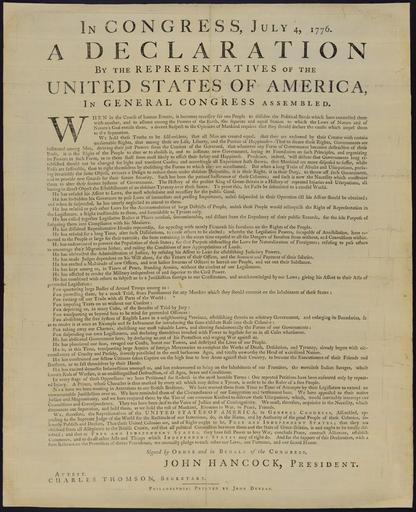 | Keywords: Declaration of Independence. In Congress, July 4, 1776, a Declaration by the Representatives of the United States of America, in General Congress Assembled. WDL109.jpg Artwork ru Джеффе сон Томас 1743-1826 fr Jefferson Thomas 1743-1826 en Jefferson Thomas 1743-1826 zh 斐 托马斯 1743-1826 pt Jefferson Thomas 1743-1826 ar جيفيرسون توماس 1743-1826 es Jefferson Thomas 1743-1826 ru Декла ация независимости Конг есс 4 июля 1776 года Декла ация п едставителей Соединенных Штатов Аме ики соб авшихся на общий конг есс fr Déclaration d'indépendance Au Congrès le 4 juillet 1776 une déclaration des représentants des États-Unis d'Amérique rassemblés en Congrès général en Declaration of Independence In Congress July 4 1776 a Declaration by the Representatives of the United States of America in General Congress Assembled zh 独立宣 : 1776 年 7 4 日的大陆会议,由参与大会的美利 联合的各邦代表们发表的宣 pt Declaração da Independência No Congresso 4 de Julho de 1776 uma Declaração dos Parlamentares dos Estados Unidos da América no Congresso Geral Reunido ar إعلان الاستقلال في الكونغرس، 4 تموز 1776، إعلان من قبل ممثلي الولايات المتحدة الأمريكية، في الاجتماع العام للكونغرس ru Данный документ является пе вой печатной ве сией аме иканской Декла ации независимости 7 июня 1776 года Ген и Ли из штата Ви гиния выступил с п едложением внести езолюцию п изывающую Конг есс заседающий в Филадельфии объявить независимость от Великоб итании Четы е дня спустя Томас Джеффе сон Джон Адамс Бенджамин Ф анклин Родже Ше ман и Робе т Р Ливингстон были назначены членами комитета по составлению текста декла ации независимости Че новой ва иант документа был зачитан в Конг ессе 28 июня 4 июля Конг есс п инял Декла ацию независимости в кото ой п иводился пе ечень п етензий к Б итанской импе ии Документ был напечатан и азослан по всем колониям в виде к упнофо матных листовок К упнофо матные листовки п едставляли собой большие листы бумаги с текстом напечатанным как п авило с одной сто оны и являлись популя ным способом быст ого асп ост анения важной инфо мации в XVIII веке Листовки вывешивались в мэ иях и кофейнях зачитывались в це квях и на общественных соб аниях часто пе епечатывались а выде жки из них п иводились в местных газетах <br>Автономия; Плакаты; Данлэп Джон 1747-1812 гг ; Соединенные Штаты - Декла ация независимости fr Ce document est la première version imprimée de la Déclaration d'indépendance américaine Le 7 juin 1776 Richard Henry Lee de Virginie présenta une résolution exhortant le Congrès réuni à Philadelphie à déclarer son indépendance vis-à-vis de la Grande-Bretagne Quatre jours plus tard un comité composé de Thomas Jefferson John Adams Benjamin Franklin Roger Sherman et Robert R Livingston fut nommé pour rédiger une déclaration d'indépendance L'ébauche du comité fut lue devant le Congrès le 28 juin Le 4 juillet le Congrès adopta la Déclaration d'indépendance qui contenait une liste de griefs contre la couronne britannique Le document fut imprimé et distribué à travers les colonies sous la forme d'un « placard » Les placards étaient de grandes feuilles de papier généralement imprimées sur un seul côté qui étaient populaires au XVIIIe siècle pour diffuser rapidement les informations importantes Ils étaient affichés dans les hôtels de ville et les tavernes lus dans les églises et pendant les réunions publiques et souvent reproduits ou cités dans les journaux locaux <br>Autonomie; Placards; Dunlap John 1747-1812; États-Unis - Déclaration d'indépendance en This document is the first printed version of the American Declaration of Independence On June 7 1776 Richard Henry Lee of Virginia introduced a resolution urging Congress meeting in Philadelphia to declare independence from Great Britain Four days later Thomas Jefferson John Adams Benjamin Franklin Roger Sherman and Robert R Livingston were appointed as a committee to draft a declaration of independence The committee s draft was read in Congress on June 28 On July 4 Congress adopted the Declaration of Independence containing a list of grievances against the British crown The document was printed and circulated throughout the colonies in the form of a broadside Broadsides were large sheets of paper usually printed on one side that were popular in the 18th century as a means for the rapid distribution of important information They were posted in town halls and coffee houses read in churches and public meetings and often reprinted or excerpted in local newspapers <br>Autonomy; Broadsides; Dunlap John 1747-1812; United States -- Declaration of Independence zh 这份文件是第 次印刷的首版 美国独立宣 1776 年 6 7 日,理查德·亨利· 提出决议, 促 费城 会的国会宣布从英国独立 四天后,托马斯· 斐 约翰
