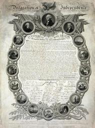 | Keywords: Declaration of Independence - USA.jpg LargeImage <font color AA0000>Note This image has 10 89 MB it would be best to download it first </font> A facsimile of the Declaration of Independence in an ornamental oval frame with medallions of seals of the thirteen original colonies and medallion portraits of John Hancock George Washington and Thomas Jefferson Above is an eagle with shield olive branch and arrows holding a streamer reading E Pluribus Unum An incomplete state of the print was deposited for copyright by John Binns on November 4 1818 It was accompanied by a prospectus card which describes the print thus A Splendid Edition of the Declaration of Independence The Design in imitation of Bas Relief will encircle the Declaration as a cordon of honor surmounted by the Arms of the United States Immediately underneath the arms will be a large medallion portrait of General George Washington supported by cornucopiae and embellished with spears flags and other Military trophies and emblems On the one side of this medallion portrait will be a similar portrait of John Hancock and on the other a portrait of Thomas Jefferson author of the Declaration of Independence The arms of 'The Thirteen United States' in medallion united by wreaths of olive leaves will form the remainder of the cordon which will be further enriched by some of the characteristic productions of the United States; such as the Tobacco and Indigo plants the Cotton Shrub Rice c The fac similes sic will be engraved by Mr Vallance who will execute the important part of the publication at the City of Washington where by permission of the Secretary of State he will have the original signatures constantly under his eye At the bottom of the print appears an endorsement by Secretary of State John Quincy Adams which reads Department of State 19th April 1819 I certify that this is a Correct copy of the original Declaration of Independence deposited at this Department; and that I have compared all the signatures of the original and found them Exact Imitations The Port Folio magazine Philadelphia for January 1819 reports We have at length been gratified with the sight of a proof-sheet of the splendid copy of the 'declaration of Independence;' and we declare that it deserves the most liberal support The writer goes on to mention that Binns's print prompted a rash of inferior imitations LOC-image pga 01013 Entered the 4th day of November 1818 by John Binns Pennsylvania S l s n c1818 published 1819 Originally designed by John Binns 1772-1860 Ornamental part drawn by Geo Bridport Arms of the United States and the Thirteen States drawn from Official Documents by Thos Sully Portrait of Genl Washington painted in 1795 by Stuart Portrait of Thomas Jefferson painted in 1816 by Otis Portrait of John Hancock painted in 1765 by Copley Ornamental Part Arms of the United States and the Thirteen States engraved by Geo Murray The writing designed and engraved by C H Parker Portraits engraved by J B Longacre Printed by James Porter No known restrictions on publication The original image was a tiff file I've equalised its contrast sharpened it and saved it as a jpg Alex D talk http //hdl loc gov/loc pnp/pga 01013 PD-Old United States Declaration of Independence Thirteen Colonies |