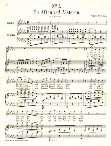 | Keywords: Dedekam song "En Aften ved Alsteren".jpg Uploaded with en wp UW marker 2016 04 05 The first page of Sophie Dedekam's song En Aften ved Alsteren published in 1885 by the Theodora Cormontan Publishing Company in Arendal Norway Original publication Originally published by the Theodora Cormontan Music Publishing Company <br/> Immediate source A scan of this song was emailed to me by the National Library of Norway 1885 Sophie Dedekam<br/> Life time Died in 1894 PD-US-1923 PD-old-100-1923 Uncategorized 2017 January 1 |