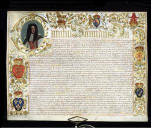 | Keywords: Deed.jpg The Grant of deed of Arms of Earl of Abingdon 1682 V A Museum no W 25 1 to 3-1987 Techniques - Vellum inscribed illuminated and gilded with a black wax seal attached by a plaited cord of metal thread Place - London England possibly The granting of an earldom would have been of paramount importance to a family particularly if it involved a promotion to higher rank A special box was required to protect the precious document and its seal without which the deed would not have been valid People - The Grant was made on 20 November 1682 to James Bertie 5th Lord Norris 1653-1699 The document includes a portrait of Charles II who reigned from 1660 to 1685 Abingdon was Lord Lieutenant of Oxfordshire from 1674 until 1687 Later he offered financial support to William III but he ended up opposing his accession to the throne and duly withdrew from the court The Lady Bettine Abingdon Collection Bequeathed by Mrs T R P Hole Document created 1682<br> 2007-12-29 Document Charles II<br> Uploaded photo VAwebteam wikipedia en PD-old-100 GFDL relicense PermissionOTRS https //secure wikimedia org/otrs/index pl Action AgentTicketZoom TicketID 1332999 Original upload log en wikipedia Quadell CommonsHelper en wikipedia Deed jpg 2007-12-29 10 36 VAwebteam 762×646× 150313 bytes <nowiki>The Grant of deed of Arms of Earl of Abingdon 1682 V A Museum no W 25 1 to 3-1987 Techniques - Vellum inscribed illuminated and gilded with a black wax seal attached by a plaited cord of metal thread Place - London England possibly The granti</nowiki> Manuscripts in the Victoria and Albert Museum 1682 works in the United Kingdom 17th-century deeds Portraits of Charles II of England 1682 in art James Bertie 1st Earl of Abingdon Bertie arms 1682 documents |