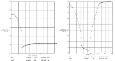 | Keywords: Deep and Shallow SR profiles.jpg en The shallow profile on the left the deep profile on the right Carrier concentration is plotted against depth Regions with a net electron concentration are denoted as n or n-type Regions with a net hole concentration are denoted as p Own Rogerprocessengineer 11/20/08 Semiconductor physics |