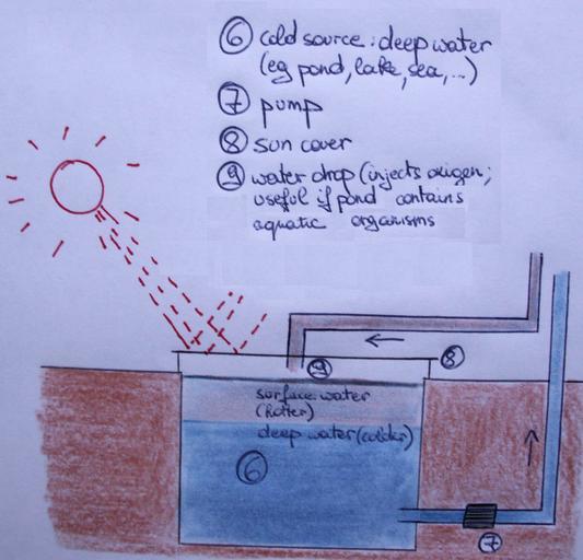 Keywords: Deep water air cooling (pond).JPG en A schematic showing a deep water source for cooling This system can be mounted at the Heat pump system Next version should include depth still unclear what minimum depth is at present for regular cooling Own KVDP 2009-08-18 DeepWaterSourceCooling svg Heating ventilation and airconditioning Air cooling |
