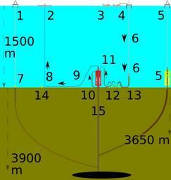 | Keywords: Deepwater Horizon oil spill recovery context numbered.svg en contextual overview of the Deepwater Horizon oil spill recovery area showing both sea surface and subsea Scale has been altered for clarity and only the main equipment is shown At the centre is a subsea blowout preventer stack installed on the seabed with a riser insertion tube in place to its left and kill and choke lines connected to a top kill mud manifold to its right Relief wells 1 and 2 are shown at the extreme right and left each drilling down to meet the blown centre well Legend red represents the blowout preventer stack grey represents the oil flow passage see 15 9 and 8 white tubing represents the kill left 10 and choke right 11 lines brown represents the top of the subsea well casing above 15 the five grey rectangles within the lower red shape represent ram-type blowout preventers the two grey rectangles within the upper red shape represent annular-type blowout preventers the orange pipes are flexible hoses connected to various rigid pipes above 10 12 and 13 Key 1 Relief Well 2 Development Driller II 2 Discoverer Enterprise 3 Kill mud ships 4 Top Kill Helix Q4000 5 Relief Well 1 Development Driller III 6 Mud pumped down by Helix Q4000 7 Relief Well 2 being drilled by Development Driller II 8 Riser Insertion Tube riser to sea surface 9 broken riser from top of blowout preventer BOP 10 Kill line into BOP 11 Choke line into BOP 12 Manifold for kill mud 13 Flexible hose interconnecting the mud pipes and manifold 14 Subsea Dispersion Injection System at end of broken riser 15 Oil well head Own illustration created with approximate reference to the following sources http //www offshore-mag com/index/article-display/323550/articles/offshore/equipment-engineering/us-gulf-of-mexico/cameron-wins-evo-subsea-bop-stack-contract html BP technical briefing linked at http //www offshore-mag com/index/article-display/5210928327/articles/offshore/deepwater-horizon/deepwater-horizon14 html Kent Wells technical update video linked at http //bp concerts com/gom/kentwells_update24052010 htm especially the illustration at time 6 54 BBC diagram at http //news bbc co uk/2/hi/world/us_and_canada/10159626 stm Economist diagram at http //media economist com/images/images-magazine/2010/21/ST/201021STC294 gif Using Inkscape 0 47 2010-05-30 User 84user thumb left Large context with large text font thumb left Large context with largest practical font size thumb left Large context numbered instead of text thumb left Subsea blowout preventer stack with top kill mud lines shown unattached thumb left stack with top kill mud lines attached thumb left stack set up for a top kill plus riser insertion tube thumb left stack in top kill mode plus riser insertion tube and kill mud manifold thumb left large context with small font showing both sea surface and subsea validSVG http //validator w3 org/check uri Created with Inkscape Oceanographic diagrams Blowout preventers Deepwater Horizon oil spill Language-neutral diagrams |