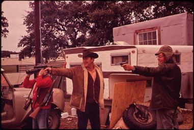 | Keywords: DEER HUNTERS AT THEIR PERMANENT CAMP AMUSE THEMSELVES BETWEEN REAL KILLS. THEY LEAVE GRAIN AT THE DEER'S FEEDING... - NARA - 546144.jpg Scope and content General notes 546144 Local identifier 412-DA-3657 Environmental Protection Agency 12/02/1970 - NARA-Author St Gil Marc 1924-1992 Photographer 8464473 <br /> Leakey Real Texas United States North and Central America inhabited place 3392043 29 717 -99 75 <br /> Still Picture Records Section Special Media Archives Services Division NWCS-S National Archives at College Park 8601 Adelphi Road College Park MD 20740-6001 11/1972 Record group Record Group 412 Records of the Environmental Protection Agency 1944 - 2006 Record group ARC 708 DOCUMERICA The Environmental Protection Agency's Program to Photographically Document Subjects of Environmental Concern compiled 1972 - 1977 Series ARC 542493 File unit File unit ARC Variant control numbers Agency-Assigned Identifier 061/57/003657<br /> NAIL Control Number NWDNS-412-DA-3657 Other versions <gallery> File DEER_HUNTERS_AT_THEIR_PERMANENT_CAMP_AMUSE_THEMSELVES_BETWEEN_REAL_KILLS _THEY_LEAVE_GRAIN_AT_THE_DEER'S_FEEDING _-_NARA_-_546144 tif tif File DEER_HUNTERS_AT_THEIR_PERMANENT_CAMP_AMUSE_THEMSELVES_BETWEEN_REAL_KILLS _THEY_LEAVE_GRAIN_AT_THE_DEER'S_FEEDING _-_NARA_-_546144 jpg jpg </gallery> NARA-cooperation PD-USGov Deer in Real County Texas Males with pistols 1972 in Texas Fashion in 1972 Hunters Pointing left DOCUMERICA |