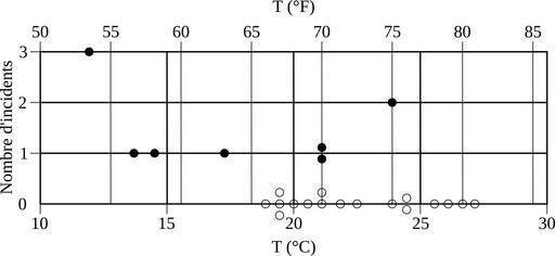 | Keywords: Defaillance joint Challenger vs temperature.svg en Space shuttle Challenger number of failure of the Morton-Thiokol gaskets vs the external temperature at the launching Initially only the incidents were reported black dots which shows no clear trend If the launching without incident are reported white dots it becomes then clear that there were always problems below 65°F 18°C fr Navette spatiale Challenger nombre de défailances de joints Morton-Thiokol en fonction de la température extérieure lors du lancement Initialement seuls les problèmes étaient rapportés points noirs ce qui ne permet pas de dégager une tendance Si par contre on reporte les lancements sans incident points blancs il devient clair qu'il y a toujours eu des problèmes en dessous de 65°F 18°C 2012-09-13 10 15 33 own from Series title Folio essais Paris 2002 978-2-07-031542-0 p 114 Cdang inkscape cdang cc-zero Uploaded with UploadWizard Risk management Space Shuttle Challenger disaster Gaskets |