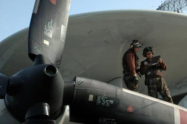 | Keywords: Defense.gov News Photo 051107-N-4321F-110.jpg en Plane Captain Airman Nathaniel Rich right and Airman Ricardo Sawh stand under the shelter of the radar rotodome as Rich instructs his trainee Sawh how to perform a daily inspection on an E-2C Hawkeye on the flight deck of the USS Kitty Hawk CV 63 on Nov 7 2005 The Hawkeye is assigned to Carrier Airborne Early Warning Squadron 115 051107-N-4321F-110 Navy http //www defense gov/photos/newsphoto aspx newsphotoid 7301 2005-11-07 en Petty Officer 3rd Class Jonathan B Foutz U S Navy PD-USGov-Military-Navy Defense gov news media for November 2005 Import by User Slick-o-bot/Defense gov News Photos Taken with Nikon D70 Northrop Grumman E-2C Hawkeye on flight decks |