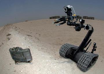 | Keywords: Defense.gov News Photo 050414-N-5526M-012.jpg en A Navy Talon 3B robot approaches a claymore land mine on a sand dune during a training exercise at a training range in Djibouti Africa on April 14 2005 Navy Explosive Ordnance Disposal technicians from Mobile Unit 4 operate the robot from safe locations through the use of monitors and video equipment attached to the robot The robot is designed for the search and destruction of Improvised Explosive Device's as well as other explosive ordnance commonly found throughout Iraq 鹰爪3B 器人与克莱莫人员 伤雷 架隶属于美国海军的鹰爪3B(Talon 3B)除雷 器人 位于 吉布提的训练 中, 近 枚埋 沙中的克莱莫人员 伤雷 鷹爪3B機器人與克萊莫人員殺傷雷 架隸屬於美 海軍的鷹爪3B(Talon 3B)除雷機器人 位於 吉布 的訓練場中, 近 枚埋 沙中的克萊莫人員殺傷雷 050414-N-5526M-012 Navy http //www defense gov/photos/newsphoto aspx newsphotoid 6608 2005-04-14 en Petty Officer 1st Class Robert R McRill U S Navy PD-USGov-Military-Navy Defense gov news media for April 2005 Import by User Slick-o-bot/Defense gov News Photos Taken with Nikon D2X M18 Claymore EOD robots Photographs by Robert R McRill Foster-Miller TALON |