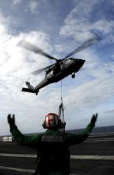 | Keywords: Defense.gov News Photo 090207-N-6538W-040.jpg en U S Navy Petty Officer 3rd Class Marcus J McElroy directs an MH-60S Sea Hawk from Helicopter Sea Combat Squadron 8 over the flight deck of the aircraft carrier USS John C Stennis CVN 74 during a vertical replenishment operation with the USNS Kiska T-AE 35 in the Pacific Ocean on Feb 7 2009 The Stennis and Carrier Air Wing 9 are on a six-month deployment to the Western Pacific 090207-N-6538W-040 http //www defense gov/photos/newsphoto aspx newsphotoid 10957 2009-02-07 en Petty Officer 3rd Class Walter M Wayman U S Navy PD-USGov-Military Import by User Slick-o-bot/Defense gov News Photos SH-60 Seahawk Taken with Nikon D200 USS John C Stennis CVN-74 flight deck |
