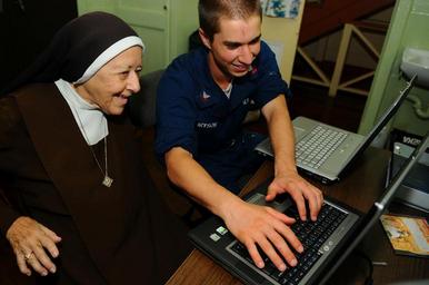 | Keywords: Defense.gov News Photo 081103-N-4515N-016.jpg en U S Navy Petty Officer 2nd Class Andrew Bryson assigned to the amphibious assault ship USS Kearsarge LHD 3 teaches Sister Helena of the Carmelite Sister Convent how to use the internet in Belmont Trinidad and Tobago on Nov 3 2008 The Kearsarge is deployed in support of the Caribbean phase of the humanitarian and civic assistance mission Continuing Promise 2008 an equal-partnership mission involving the United States Canada the Netherlands Brazil Nicaragua Colombia Dominican Republic Trinidad and Tobago and Guyana 081103-N-4515N-016 http //www defense gov/photos/newsphoto aspx newsphotoid 10703 2008-11-03 en Seaman Apprentice Joshua Adam Nuzzo U S Navy PD-USGov-Military Import by User Slick-o-bot/Defense gov News Photos Taken with Nikon D300 People using computers in the 2000s Black brown white Blue clothing male Brown and white clothing Discalced Carmelite nuns USS Kearsarge LHD-3 |