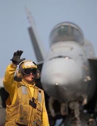 | Keywords: Defense.gov News Photo 080513-N-5384B-036.jpg en A U S Navy aircraft director signals to a tractor driver during flight operations aboard the Nimitz-class aircraft carrier USS Abraham Lincoln CVN 72 while underway in the Persian Gulf on May 13 2008 The Lincoln is deployed to the U S Navy 5th Fleet area of responsibility to support maritime security operations 080513-N-5384B-036 http //www defense gov/photos/newsphoto aspx newsphotoid 10231 2008-05-13 en Petty Officer 3rd Class Justin Blake U S Navy PD-USGov-Military Import by User Slick-o-bot/Defense gov News Photos Aboard USS Abraham Lincoln CVN-72 Taken with Nikon D200 USS Abraham Lincoln CVN-72 flight deck |