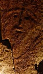 | Keywords: Déhus le gardien du tombeau visage.jpg fr Détail d'une gravure représentant un anthropomorphe sur une dalle de couverture du tombeau mégalithique néolithique du Dehus à Vale sur l'île de Guernesey own Temp Wingas 2010-10-27 Dehus Dolmen Prehistoric art in Guernsey |