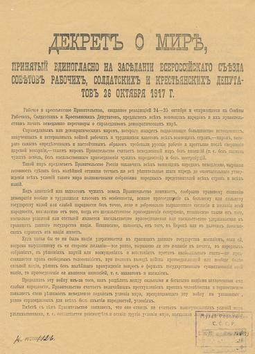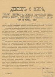 | Keywords: Dekret o mire.png Decree of peace Scan of document from revolution museum in Moscow USSR now Russia 1917-10-26 Lenin PD-old 26 October Russian Revolution of 1917 Documents of the Soviet Union Politics of World War I World War I in November 1917 |