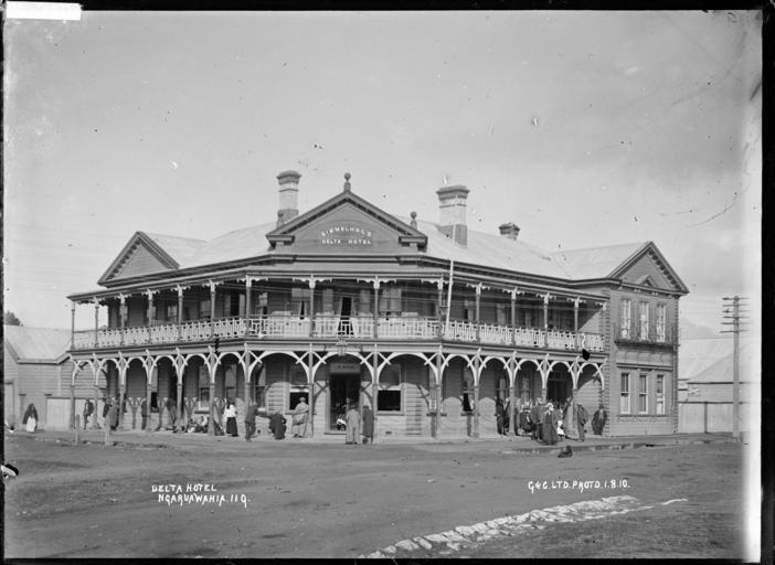 | Keywords: blackandwhite monochrome photo border outdoor architecture building black and white View of Simmelhag's Delta Hotel at Ngaruawahia. The proprietor's name, H. Ryan, is on a board immediately above the main entrance. He is listed in Wise's as being the proprietor in 1912. Photographed by G & C Ltd (Probably Green & Colebrook, merchants, with a branch in Ngaruawahia) Inscriptions: Inscribed - Photographer's title on negative -bottom left: Delta Hotel. Ngaruawahia. 119bottom right: G & C Ltd. Protd 1.8.10. Quantity: 1 b&w original negative(s). Physical Description: Dry plate glass negative 4.5 x 6.5 inches Green & Colebrook (Firm). Delta Hotel at Ngaruawahia, 1910 - Photograph taken by Green & Colebrook. Price, William Archer, 1866-1948 :Collection of post card negatives. Ref: 1/2-001601-G. Alexander Turnbull Library, Wellington, New Zealand. natlib.govt.nz/records/23151244 View of Simmelhag's Delta Hotel at Ngaruawahia. The proprietor's name, H. Ryan, is on a board immediately above the main entrance. He is listed in Wise's as being the proprietor in 1912. Photographed by G & C Ltd (Probably Green & Colebrook, merchants, with a branch in Ngaruawahia) Inscriptions: Inscribed - Photographer's title on negative -bottom left: Delta Hotel. Ngaruawahia. 119bottom right: G & C Ltd. Protd 1.8.10. Quantity: 1 b&w original negative(s). Physical Description: Dry plate glass negative 4.5 x 6.5 inches Green & Colebrook (Firm). Delta Hotel at Ngaruawahia, 1910 - Photograph taken by Green & Colebrook. Price, William Archer, 1866-1948 :Collection of post card negatives. Ref: 1/2-001601-G. Alexander Turnbull Library, Wellington, New Zealand. natlib.govt.nz/records/23151244 |