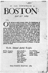 | Keywords: Demand for Surrender of Sir Edmund Andros.jpg Demand for Surrender of Sir Edmund Andros From Wikisource The Founding of New England by w James Truslow Adams http //www dinsdoc com/adams-1-i11 htm Broadside in Massachusetts Archives State House Boston 1689 signed by several citizens PD-old-100 History of Boston James Truslow Adams Boston in the 1680s Massachusetts Archives 18 April 1689 Edmund Andros Surrendering | ||||