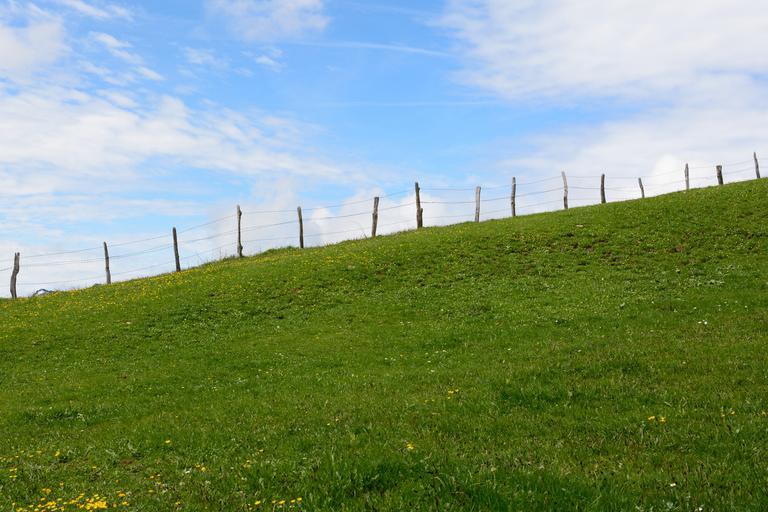 Keywords: demarcation barbed wire fence hill mountain slope meadow nature green grass hilly increase in skewness tilt horizon wide clouds