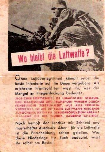 | Keywords: Demoralization Leaflet GE-233 front.jpeg  en Front of US Government leaflet attempting to demoralize German enemy by asking why they had been abandoned by their air force 1943 http //www psywarrior com/DivideandConquer html Federal Government PD-USGov World War II anti-German propaganda Uploaded with UploadWizard |