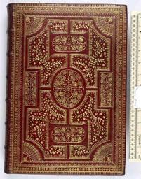 | Keywords: Dendrologiae naturalis scilicet arborum historiae libri duo - Upper cover (Davis877).jpg Style Fan Fanfare Pointille comprising dots ; Caption Upper cover; Colour Red; Edge Gilt exhibition history Decorative Technique Tooled in gold; Cover Material Goatskin includes morocco turkey etc Made in Bologna See also tools on C47i3 C128d5 Endbands single with a bead; yellow and blue silk over leather cores cut off tied down object history Text 1668/7; Bologna; Unspecified object type Cc-zero place of creation Binding Italy place of discovery M M Foot the Henry Davis Gift vol III p438 Tolomei Legatura romana barocca no 70 British Library image http //www bl uk/catalogues/bookbindings/LargeImage aspx RecordId 020-000002184 ImageId ImageId 40697 Copyright BL Dendrologiae naturalis scilicet arborum historiae libri duo Uploaded with GWToolset Dendrologiae naturalis scilicet arborum historiae libri duo - Upper cover Davis877 http //www webarchive org uk/bldatasets/bindings/7199_4 jpg Bookbinding 17th-century bookbinding British Library Bookbindings |