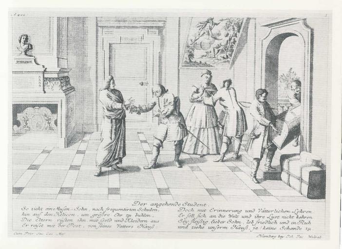 | Keywords: Dendrono - Der angehende Student.jpg  de Dendrono de Johann Georg Puschner Der angehende Student Kupferstich von 1725 Szenen aus dem Leben der Studenten an der de Universität Altdorf Der angehende Student So zieht ein Musen-Sohn nach frequentirten Schulen hin auf den Helicon um größre Ehr zu buhlen Die Eltern rüsten ihn mit Geld und Kleidern aus Er reiset mit der Post von seines Vatters Hauß Doch mit Erinnerung und Vätterlichen Lehren Er soll sich an die Welt und ihre Lust nicht kehren Sey fleißig lieber Sohn leb friedlich und in Ruh Und ziehe unserm Hauß ja keine Schande zu en Copper engraving of de Johann Georg Puschner alias Dendrono of 1725 The beginner student Altdorf University Germany 1725 Konrad Lengenfelder Hrsg Dendrono-Puschners Natürliche Abschilderung des Academischen Lebens in schönen Figuren ans Licht gestellet 2 Auflage Altdorf 1993 1 Auflage Nürnberg 1962 Johann Georg Puschner PD-old-100 Uploaded with UploadWizard Students in art Students in Germany Academic dress in Germany 1720s engravings Natürliche Abschilderung des academischen Lebens |
