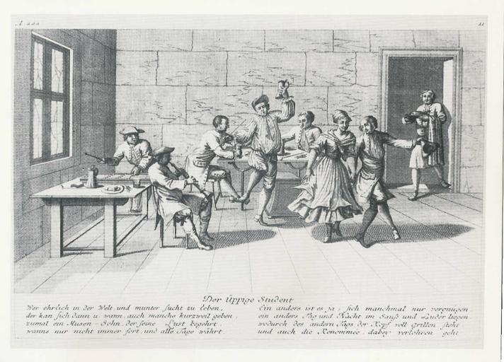 | Keywords: Dendrono - Der üppige Student.jpg  de Dendrono de Johann Georg Puschner Der üppige Student Kupferstich von 1725 Szenen aus dem Leben der Studenten an der de Universität Altdorf Der üppige Student Wer ehrlich in der Welt und munter sucht zu leben der kann sich dann u wann auch manche kurzweil geben zumal ein Musen-Sohn der seine Lust begehrt wanns nur nicht immer fort und alle Tage währt Ein anders ist es ja sich manchmal nur vergnügen Ein anders Tag und Nacht im Sauß und Luder liegen Wodurch des andern Tags der Kopf voll Grillen steht Und auch die Renommée dabey verlohren geht en Copper engraving of de Johann Georg Puschner alias Dendrono of 1725 The opulent student Altdorf University Germany 1725 Natürliche Abschilderung des academischen Lebens de Johann Georg Puschner PD-old-100 Uploaded with UploadWizard Students in art Students in Germany Academic dress in Germany 1720s engravings Natürliche Abschilderung des academischen Lebens Taverns in art 18th-century dancers |