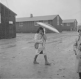 | Keywords: DensonRelocationCampUmbrellaGirl.jpg Jerome Relocation Center Denson Arkansas The Arkansas rainy season and this young resident of the Jerome Center dons rubber boots and carries a parasol The buckshot mud makes the trip to and from school a little dificult Japanese American interment camp during World War II Photograph by Tom Parker for Department of the Interior War Relocation Authority NARA-image 539345 Converted from gif to jpg and border cropped before upload 03/12/1943 Tom Parker Unrestricted PD-USGov Jerome War Relocation Center Girls of the United States Denson Arkansas School children of the United States 1943 in Arkansas Parasols People in the rain Tom Parker photographer Students in Arkansas |