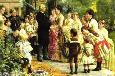 | Keywords: Der 70ste Geburtstag des Kommerzienrates Valentin Manheimer, von Anton von Werner, 1887.jpg Artwork creator Anton von Werner en The 70th Birthday of Commercial Councilor Valentin Manheimer de Das Porträt des jüdischen Unternehmers und Kommerzienrates Valentin Manheimer geb 1815 wurde vom Hohenzoller Hofmaler Anton von Werner 1843-1915 gemalt worin auch der Großteil dieses Bildes liegt da es das Ausmaß angibt bis zu dem die Juden es geschafft hatten in den Rängen der Berliner Oberschicht aufgenommen zu werden wodurch sie zumindest auf eine gewisse Art und Weise ždes Hofes würdig geworden waren Werner wurde damit beauftragt Manheimers 70ste Geburtstagsfeier zu malen welche im Brunnenhaus im Garten seiner Villa in der Bellevuestraße 8 in Berlin statt fand Hier zu sehen ist Mannheimers Ehefrau Philippine dritte von links im schwarzen Kleid sowie auch seine Töchter und Enkelkinder Die Tatsache dass Manheimers Frau den Maler der für seine Preußischen Historienszenen und die Darstellung der kaiserlichen Herrscherschicht bekannt war für dieses Ereignis engagierte und dass er dem auch zustimmte impliziert dass sogar eine Modemacherin für Frauenkleidung im Neuen Berlin das Sagen haben konnte Manheimer war im Jahre 1836 nach Berlin gekommen Er startete sein Kleidungsunternehmen was der Firmenlegende zufolge jedoch lediglich mit dem Geld erfolgte das er zuvor in der Staatslotterie gewonnen hatte Sogar noch vor der Gründung des Reiches hatten es sein Talent für die industrielle Herstellung und internationales Marketing Manheimer erlaubt ein beträchtliches Vermögen anzuhäufen In den 1880er Jahren beschäftigte seine Firma 8000 Angestellte aber während der Großen Depression die 1929 begann ging sie bankrott en This portrait of the Jewish entrepreneur and commercial councilor Valentin Manheimer b 1815 was painted by the Hohenzollern court painter Anton von Werner 1843-1915 “ and therein lies much of its significance for it conveys the extent to which Jews had entered the ranks of the upper classes in Berlin and had thus become in one sense at least court worthy Werner was commissioned to paint Manheimer ™s 70th birthday celebration which took place in the fountain house in the garden of his villa at Bellevuestraße 8 in Berlin We see Manheimer ™s wife Philippine third from left in the black dress as well as his daughters and grandchildren That Frau Manheimer commissioned the famous painter of Prussian historical scenes and imperial royalty to document this event and that he accepted suggests the esteem that even a milliner of women ™s clothing could command in the new Berlin Manheimer had arrived in the city in 1836; he started his textile business according to the firm ™s legend with only the money he had won in a state lottery Even before the founding of the empire Manheimer ™s talent for industrial production and international marketing had allowed him to amass a considerable fortune By the 1880s his firm employed around 8 000 people but it went bankrupt during the Great Depression which began in 1929 1879 Oil on canvas 110 x 140 cm from Bildarchiv Preußischer Kulturbesitz http //germanhistorydocs ghi-dc org/sub_image cfm image_id 1352 Public Domain since author died more than 70 years ago PD-old-auto 1915 Anton von Werner Valentin Manheimer Families in art |