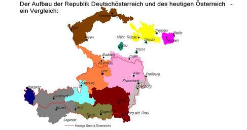 | Keywords: Der Aufbau der Republik Deutschösterreich.png DarkOrange Provinz Oberösterreich 15 162 km² 1 03 Millionen Einwohner 1910 bekannten sich für das ehemalige Kronland Österreich ob der Enns ohne Deutschsüdböhmen 99 7 der Einwohner als Deutsche und 0 2 als Tschechen Violet Provinz Niederösterreich 22 048 km² 3 72 Millionen Einwohner 1910 bekannten sich für das ehemalige Kronland Österreich unter der Enns ohne den Deutsch-Südmährischen Kreis 95 5 als Deutsche und 3 7 als Tschechen 0 1 gaben ein anderes Volkstum an SaddleBrown Provinz Deutschböhmen 14 496 km² 2 23 Millionen Einwohner 1919 bekannten sich von den Einwohnern 2 07 Millionen als Deutsche und 116 275 als Tschechen Yellow Provinz Sudetenland 6 534 km² 678 880 Einwohner 1919 bekannten sich von den Einwohnern 643 804 als Deutsche 25 028 als Tschechen und 5 200 als Polen Maroon Provinz Steiermark 22 426 km² 1 44 Millionen Einwohner 1910 bekannten sich von den Einwohnern 70 5 als Deutsche und 29 5 als Slowenen Aqua Provinz Salzburg 7 153 km² 214 997 Einwohner 1910 bekannten sich 99 7 der Einwohner als Deutsche DarkOliveGreen Provinz Kärnten 10 327 km² 394 735 Einwohner 1910 bekannten sich 78 6 als Deutsche und 21 4 als Slowenen DarkGray Provinz Deutschtirol 20 047 km² 1 09 Millionen Einwohner 1910 bekannten sich in der Provinz 839 000 als Deutsche 20 000 als Ladiner und 3 000 als Italiener Navy Provinz Vorarlberg 2 602 km² 145 794 Einwohner 1910 bekannten sich von den Einwohnern 95 als Deutsche und 5 als Italiener Green Die Einschlussgebiete Deutschösterreichs Iglau 374 km² 31 000 Einwohner 1920 Davon 17 000 Tschechen und 14 000 Deutsche Brünn 70 km² 263 600 Einwohner 1920 Davon 209 600 Tschechen und 54 000 Deutsche Olmütz 42 km² 66 400 Einwohner 1920 Davon 51 400 Tschechen und 15 000 Deutsche Von Deutschösterreich formal beanspruchte Gebiete LightGrey Deutschwestungarn HotPink Ostschlesien gemeinschaftliche Verwaltung mit Polen und der Tschechoslowakei vorgeschlagen DarkOrange Province of Upper Austria 15 162 km² 1 03 million inhabitant In 1910 99 7 of the inhabitants of the former Crown Land of Austria Beyond the Enns identified themselves as Germans and 0 2 as Czechs Violet Province of Lower Austria 22 048 km² 3 72 million inhabitant In 1910 95 5 of the inhabitants of the former Crown Land of Austria Under the Enns without the area of German Southen Moravia identified as Germans and 3 7 as Czechs 0 1 indicated another nationality SaddleBrown Province of German Bohemia 14 496 km² 2 23 million inhabitant In 1919 2 07 million identified themselves as Germans and 116 275 as Czechs Yellow Province of Sudetenland 6 534 km² 678 880 inhabitants In 1919 643 804 identified themselves as Germans 25 028 as Czechs and 5 200 as Poles Maroon Province of Styria 22 426 km² 1 44 million inhabitant In 1910 70 5 of the inhabitants identified themselves as Germans and 29 5 as Slovenes Aqua Province of Salzburg 7 153 km² 214 997 inhabitants In 1910 99 7 of the inhabitants identified themselves as Germans DarkOliveGreen Province of Carinthia 10 327 km² 394 735 inhabitants In 1910 78 6 of the inhabitants identified themselves as Germans and 21 4 as Slovenes DarkGray Province of German Tyrol 20 047 km² 1 09 million inhabitant In 1910 839 000 of the inhabitants identified themselves as Germans 20 000 as Ladiner and 3 000 as Italians Navy Province of Vorarlberg 2 602 km² 145 794 inhabitants In 1910 95 of the inhabitants identified themselves as Germans and 5 as Italians Green The inclusion areas of German-Austria Iglau 374 km² 31 000 inhabitants 1920 Thereof 17 000 Czechs and 14 000 Germans Bruenn 70 km² 263 600 inhabitants 1920 Thereof 209 600 Czechs and 54 000 Germans Olmuetz 42 km² 66 400 inhabitants 1920 Thereof 51 400 Czechs and 15 000 Germans Areas officially claimed by German-Austria LightGrey German West Hungary HotPink East Silesia joint administration with Poland and Czechoslovakia suggested Border of the subsequent First Austrian Republic and modern Austria 1px solid red Own work<br/> Data sources Fibel zur Deutschlandfrage Vol 1 Hermann Schroedel Verlag KG Berlin Hanover Darmstadt 1962 ; Der Große Brockhaus Vol 1-4 1938 ; Alexander Sixtus von Reden Österreich-Ungarn - Die Donaumonacharchie in historischen Dokumenten Verlag Carl Ueberreuter 1995 Renate Basch Ritter Österreich-Ungarn in Wort und Bild« Menschen und Länder Verlag Styria 1989 Quellen »Fibel zur Deutschlandfrage« Bd 1 vom Hermann Schroedel Verlag KG Berlin-Hannover-Darmstadt 1962 ; »Der Große Brockhaus« Bd 1-4 1938 ; Alexander Sixtus von Reden »Österreich-Ungarn - Die Donaumonacharchie in historischen Dokumenten« Verlag Carl à berreuter 1995 Renate Basch-Ritter »Österreich-Ungarn in Wort und Bild« Menschen und Länder Verlag Styria 1989 2006-03-02 02 46 Postmann Michael Postmann Michael <gallery>File Deutschösterreich1 png Deutschösterreich1 png</gallery> historical map Maps of the history of Austria Maps of the history of Burgenland Sudetenland |