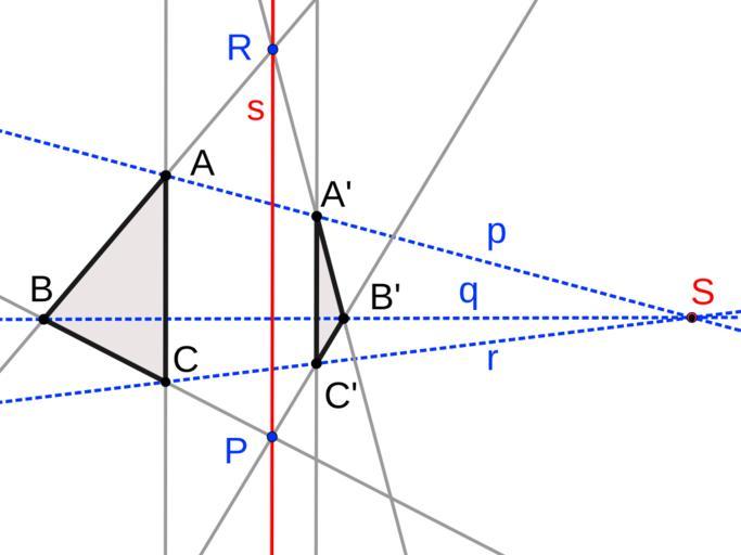 Keywords: Desargues affine.svg en Desargues theorem with one of the 3 collinear points at infinity fr théorème de Desargues avec un des 3 points alignés à l'infini own using geogebra inkscape and scour Proz Cc-zero Desargues' theorem
