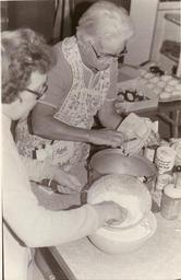 | Keywords: churches cooking 1970s monochrome indoor On back of photograph: "Presbytereon [sic] ladies making Easter eggs. Mrs Blake Moore, Mrs Dorothy McCullough". Mrs McCullough is measuring butter into a pan, while Mrs Moor appears to be sifting Redpath icing sugar into a bowl. This activity was taking place at the Presbyterian Church of the Redeemer in St. George Street, Deseronto, Ontario. On back of photograph: "Presbytereon [sic] ladies making Easter eggs. Mrs Blake Moore, Mrs Dorothy McCullough". Mrs McCullough is measuring butter into a pan, while Mrs Moor appears to be sifting Redpath icing sugar into a bowl. This activity was taking place at the Presbyterian Church of the Redeemer in St. George Street, Deseronto, Ontario. |