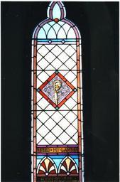 | Keywords: churches 2000s stained glass stainedglass windows trellis architecture window Stained glass window of St. Mark's Anglican Church, Deseronto, Ontario, depicting a crosier and the phrase 'Feed my lambs'. At the base of the window are the words 'Given by the confirmation class, 1894'. Taken on the day of the deconsecration ceremony, December 2001. Stained glass window of St. Mark's Anglican Church, Deseronto, Ontario, depicting a crosier and the phrase 'Feed my lambs'. At the base of the window are the words 'Given by the confirmation class, 1894'. Taken on the day of the deconsecration ceremony, December 2001. |
