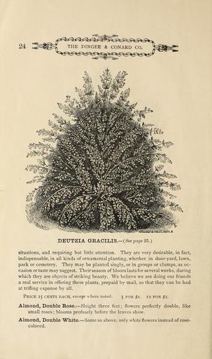| Keywords: Descriptive catalogue of new and beautiful roses (16249135048).jpg DEUTZIA G-RAC11 IS See page 25 <br> situations and requiring but little attention They are very desirable in fact <br> indispensable in all kinds of ornamental planting whether in door-yard lawn <br> park or cemetery They may be planted singly or in groups or clumps as oc- <br> casion or taste may suggest Their season of bloom lasts for several weeks during <br> which they are objects of striking beauty We believe we are doing our friends <br> a real service in offering these plants prepaid by mail so that they can be had <br> at trifling expense by all <br> Price 25 cents each except where noted 5 FOR 1 12 FOR 2 <br> Almond Double Rose Height three feet ; flowers perfectly double like <br> small roses ; blooms profusely before the leaves show <br> Almond Double White Same as above only white flowers instead of rose- <br> colored 43902562 150007 78561 Page 24 Text http //www biodiversitylibrary org/page/43902562 1875 10 5962/bhl title 78561 Dingee Conard Co ; Henry G Gilbert Nursery and Seed Trade Catalog Collection NameFound Deutzia NameConfirmed Deutzia EOLID 11171771 NameBankID 2649641 Biodiversity Heritage Library Descriptive catalogue of new and beautiful rosesnew album Garden Stories Catalogs Flowers Roses Seeds Trade catalogs U S Department of Agriculture National Agricultural Library bhl page 43902562 dc identifier http //biodiversitylibrary org/page/43902562 bhlgardenstories deutzia gracilis Dingee Conard Co taxonomy binomial Deutzia gracilis BHLinbloom u s department of agriculture national agricultural library dingee conard co taxonomy binomial deutzia gracilis bhlinbloom Information field Flickr posted date ISOdate 2015-02-03 CC-BY-2 0 BioDivLibrary https //flickr com/photos/61021753 N02/16249135048 2015-08-24 05 54 58 cc-by-2 0 PD-old-70-1923 Descriptive catalogue of new and beautiful roses Photos uploaded from Flickr by FĂŚ using a script |