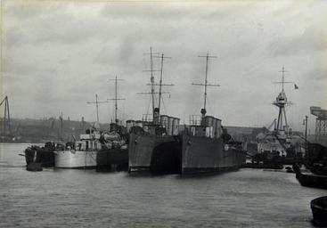 Keywords: ww1 royal navy royalnavy first world war firstworldwar hawthorn leslie hawthornleslie shipbuilding hebburn hms marksman hmsmarksman hms talisman hmstalisman hms termagant hmstermagant destroyer torpedo boat destroyer torpedoboatdestroyer shipyard maritime heritage maritimeheritage industry black and white photograph blackandwhitephotograph digital image digitalimage destroyers moored 5 november 1915 5november1915 hawthorn leslie warships hawthornlesliewarships battle of jutland battleofjutland wartime naval military industrial heritage industrialheritage abstract warships constuction structure deck rail sky cloud grain mark float rope bank buildings mast cylinder flag pole roof wall vessel unusual fascinating majestic outdoor waterfront water black and white HMS Marksman, HMS Talisman and HMS Termagant moored at the Hawthorn Leslie shipyard, Hebburn, 5 November 1915 (TWAM ref. 4471/3). HMS Termagant took part in the Battle of Jutland with the Royal Navy's 13th Destroyer Flotilla. The shipyard of R. & W. Hawthorn Leslie at Hebburn built many fine warships. During the First World War the firm built 2 light cruisers, 3 destroyer leaders and 25 torpedo boat destroyers. The firm also built machinery and boilers for 2 battleships, and a further 3 light cruisers. These and other warships built by Hawthorn Leslie before the War, are remembered in this set. There are remarkable images of warships under construction at Hebburn, as well as fascinating shots of the people who attended the launches. The set also contains majestic views of the ships at sea. The images are not only a testimony to the skill of those who designed and built these ships but also to the courage of those who sailed in them. (Copyright) We're happy for you to share these digital images within the spirit of The Commons. Please cite 'Tyne & Wear Archives & Museums' when reusing. Certain restrictions on high quality reproductions and commercial use of the original physical version apply though; if you're unsure please email archives@twmuseums.org.uk HMS Marksman, HMS Talisman and HMS Termagant moored at the Hawthorn Leslie shipyard, Hebburn, 5 November 1915 (TWAM ref. 4471/3). HMS Termagant took part in the Battle of Jutland with the Royal Navy's 13th Destroyer Flotilla. The shipyard of R. & W. Hawthorn Leslie at Hebburn built many fine warships. During the First World War the firm built 2 light cruisers, 3 destroyer leaders and 25 torpedo boat destroyers. The firm also built machinery and boilers for 2 battleships, and a further 3 light cruisers. These and other warships built by Hawthorn Leslie before the War, are remembered in this set. There are remarkable images of warships under construction at Hebburn, as well as fascinating shots of the people who attended the launches. The set also contains majestic views of the ships at sea. The images are not only a testimony to the skill of those who designed and built these ships but also to the courage of those who sailed in them. (Copyright) We're happy for you to share these digital images within the spirit of The Commons. Please cite 'Tyne & Wear Archives & Museums' when reusing. Certain restrictions on high quality reproductions and commercial use of the original physical version apply though; if you're unsure please email archives@twmuseums.org.uk