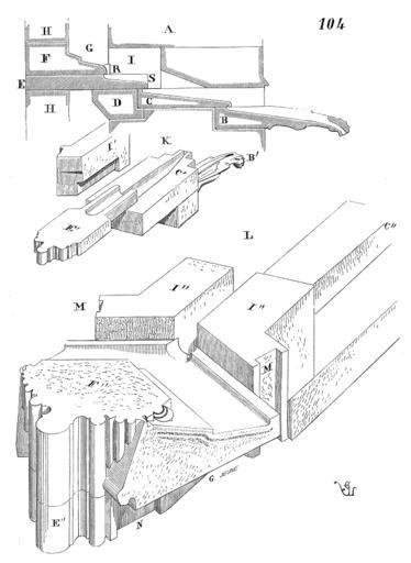 | Keywords: Detail.contre.fort.abside.Saint.Urbain.Troyes.png Prenons donc d'abord toute la partie du contre-fort comprise entre H et O c'est-à-dire le plafond de la galerie et son linteau reliant la pile intérieure au contre-fort l'enchâssement de claires-voies et l'écoulement des eaux sur ce point En A 104 on voit la coupe prise dans l'axe du contre-fort et de la pile B est la gargouille rejetant à l'extérieur les eaux recueillies sur le passage G c'est-à-dire non-seulement la pluie tombant verticalement sur ce dallage ce qui est peu de chose mais celle fouettant contre les vitraux Plans et relevés de la basilique Saint-Urbain de Troyes Buttresses in France Drawings of buttresses |
