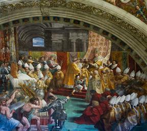 | Keywords: Detail coronation Charles the Great (Francis 1st of France) by Pope Leo III (Leo X) Vatican 11.jpg Artwork Creator Raffaello Sanzio Coronación de Carlomagno detalle Coronation of Charlemagne detail Le couronnement de Charlemagne détail L'Empereur a le visage de François 1er tandis que Léon III a celui de Léon X 1514-15 2013-08-21 for photograph Fresco Base cm 770 Institution Musei Vaticani own Jebulon as photographer PD-Art-100 41 905 12 454183 cc-zero Uploaded with UploadWizard Coronation of Charlemagne by Raphael Quality images by Jebulon QualityImage |