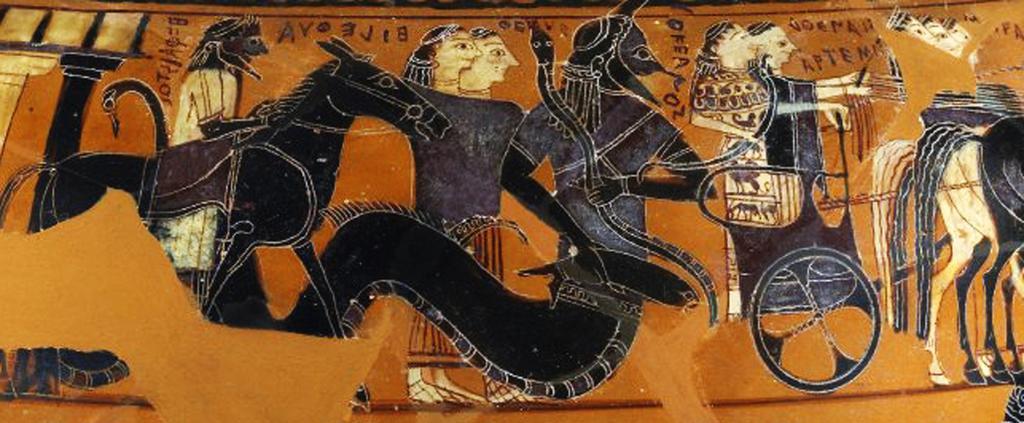 | Keywords: Detail of Sophilos Dinos 570 BCE British Museum.jpg en Detail of Ancient Greek black-figured dinos wine-bowl and stand with Athena and Artemis riding in the last chariot followed by Thetis' grandfather the fish-tailed sea-god Okeanos his wife Tethys and Eileithyia goddess of childbirth Hephaistos brings up the rear seated side-saddle on a mule 580-570BCE British Museum Sophilos other versions PD-old-100 Greece Pottery Black-figure pottery Okeanos Thetis Hephaistos Athena Artemis Uploaded with UploadWizard |