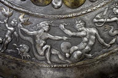 | Keywords: Detalj, dekor, Rundsköld, Polen ca 1550, efter italiensk förebild - Livrustkammaren - 50181.tif Rund sköld med dekor i tre fält Ytterst en slät kantbård i ytterkanten 36 fyrsidiga taggar med spår av förgyllning Därinnanför en ring kantad med lagerkransbårder spår av förgyllning på ringen i hög relief ett nereid-och tritontåg mot punsad bakgrund spår av förgyllning I mitten en krysantemumblomma med 12 större blad med rester av förgyllning och däremellan smalare blanka blad I mitten en uppdriven spets däri inskruvat en 142 mm hög balusterformig fyrsidig spets med fasade kanter rester av förgyllning Ett hål på vardera sidan om spetsen <br/><br/>På baksidan ett kraftigt stålhandtag l 150 mm på motsatta sidan fastnitat en läderrem l 330 mm med ett hål samt en sölja av stål fastnitad i ett dubbelt stålband b 30 mm som i sin tur är nitat i skölden <br/><br/>Krigsbyte från Warszawa 1655-08-30 I LRK äldre inventarier upptagen som en del av Magnus Ladulås rustning utställd i kungalängden i Riddarholmskyrkan 1823-1855 original caption Detalj dekor Rundsköld Polen ca 1550 efter italiensk förebild LRK 2935<br/> Nyckelord Mytologisk Sköld Föremålsbild Figurer Erövringen av Warszawa ca 1550 steel - leather g 4730 size mm 565 LRK Wawel 1000-2000 2000 Eagle and Three Crowns 2002 Eagle and Three Crowns 2002 Sweden and Europe 1632-1792 2003-2004 Örnen och de tre kronorna 2003 Parures Triomphales 2003 Krigsbyte 2007-2008 Imagines potestatis - Regalia and Symbols of Authority of Polish Kings and Grand Masters of the Teutonic Knights 2007 Europa Jagellonica 1386-1572 - Kunst und Kultur Mitteleuropas zur Zeit der Jagiellonen 2012-2013 Kutná Hora Warszawa Potsdam place of origin original filename lm_dig2885 39545 inventory number LRK 2935 50181 CC-BY-SA Göran Schmidt <gallery caption Different images of same object > File Rundsköld - Livrustkammaren - 25699 tif File Rundsköld - Livrustkammaren - 77058 tif File Detalj dekor Rundsköld Polen ca 1550 efter italiensk förebild - Livrustkammaren - 67304 tif File Detalj dekor Rundsköld Polen ca 1550 efter italiensk förebild - Livrustkammaren - 58742 tif </gallery> Göran Schmidt Media contributed by LSH unmatched event Media contributed by LSH unmatched objKeyword Media contributed by LSH unmatched place Media contributed by LSH unmatched keyword Round shields Color images from Livrustkammaren Shield images from Livrustkammaren Media contributed by LSH 2013-10 |