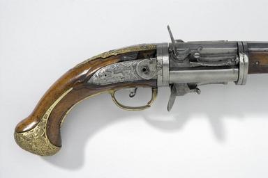 | Keywords: Detalj flintlåsrevolver - Livrustkammaren - 31099.jpg Rund vid bakre delen åttsidig pipa På undersidan fäst en klack med hål för pipstiftet I bakkanten en rund bricka d 52 4 mm tjocklek 4 9 mm med hål för loppet och två större hål d 16 5 mm I mitten axel gängad i bakre änden <br/>Riktmedel Spolformigt korn av mässing <br/>Fästning Ett häfte <br/><br/>På axeln fäst en revolverande trumma med tre pipor fastskruvade i den bakre av två brickor d 52 8 och 53 6 mm pipor och skruvar märkta med skåror 1 11 och 111 skruvhuvudet till pipa 1 avbrutet Den främre brickan påträdd piporna samma markering I brickan fastskruvat tre bleck intappade i den bakre brickan med kantiga fängpannor med fals Batterier med plana fängpannelock med fasade kanter eldstål med rundade överändar och konturerad ås på ryggarna Enkel ej vinklad batterifjäder Trumbotten d 53 9 mm tjocklek 6 5 mm med svansskruvblad och avtryckarbleck hål för två genomgående skruvar Kort avtryckare med upprullad ände I trumbottens mitt hål för trumaxeln sexkantig mutter Rotationsspår spärr i form av ett sexkantigt stålbleck fastskruvat under svansskruvbladet runt hål för trumaxeln på framsidan en klack som går ut genom trumbottnen och hakar i hak i trumman Nederspetsen går ut genom urtag i avtryckarblecket där varbygelns framstolpe utgör fingergrepp <br/><br/>Flintlås med välvt låsbleck l 90 mm framtill fiskstjärtformig och infäst i trumbottnen Graverad dekor hjort som jagas av två hundar i landskap Hanen saknas Slagfjäder som trycker uppåt på nöten flikig nötstudel <br/>Fästning En urspr två låsskruvar <br/><br/>Helstock av valnöt i två delar ristad och skuren runt lås varbygel sidbleck och svansskruvblad Framstocken odekorerad med sluten laddstocksränna Gjutna beslag av mässing Kolvkappa med flikar till lås- och sidbleck rankdekor samt på sidorna pistolstrider på ena sidan två ryttare i västerländska dräkter i hörnen tält På motsatta sidan en ryttare i västerländsk och en i orientalisk dräkt som just faller av hästen Centrumplattan och kolvkappans fästskruv saknas Sidbleck av låsbleckets form med graverad och punsad dekor rankor och vid främre låsskruven två harar i landskap vid den bakre en framkommande hund Varbygel i två delar med fri framstolpe rotationsspärr på bygeln releifdekor ryttare som blåser i horn slät välvd bakre arm original caption detalj flintlåsrevolver - LRK 4671<br/> Nyckelord Flintlåsrevolver Föremålsbild Detalj early other date century 18 steel e12 - eldvapen - pipa och lås material stål - wood e3 - eldvapen - stock material trä - brass e7 - eldvapen - stockbeslag material mässing size mm 464 size mm 183 pipa size mm 146 g 1800 LRK place of origin original filename lm_dig2085 41204 inventory number LRK 4671 31099 CC-BY-SA Göran Schmidt <gallery caption Different images of same object > File Flintlåsrevolver - Livrustkammaren - 22537 jpg </gallery> Göran Schmidt Media contributed by LSH dim-with multiple size templates Media contributed by LSH unmatched objKeyword Media contributed by LSH unmatched creator Media contributed by LSH unmatched keyword Flintlock firearms Color images from Livrustkammaren Revolvers images from Livrustkammaren Early repeating firearms Media contributed by LSH 2013-10 |