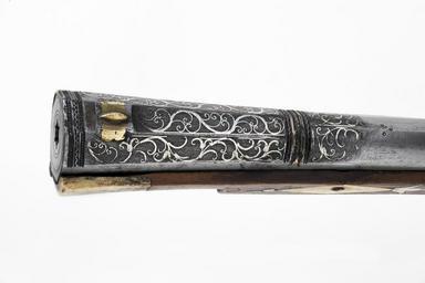 | Keywords: Detalj pipdekor snapplåsbössa - Livrustkammaren - 6371.jpg Sexräfflad pipa med åttsidig pipa och trumf Partiet däremellan med svinrygg Dekor på bakre delen av kammaren framför siktet samt hela trumfens ovansida i form av rankornament av påslaget silver På de två senare ställena två tvärgående profilerade band med dekor av koppar och mässing <br/>Riktmedel Vingformigt sikte av stål med profilerad klack avslutad framåt med bladornament Spolformigt stolpkorn av mässing <br/><br/>Snapplås av skandinavisk-baltisk typ Plant låsbleck med kulformigt utskott baktill Hane av baltisk typ med lös överkäke ringformigt käkskruvhuvud Batteri med omvändningseldstål med liten fjäder fastskruvad på fängpannelocket mellan eldstål och pipa Fängpanna med plan gavel rundad nederkant med filad dekor Eldstål av flintlåsform med profilerad åsning på ryggen Batterifjäder utan studel <br/>Fästning Två låsskruvar <br/>Rak avtryckare <br/><br/>Helstock av trä med kolv av tysk-rysk typ med bred vinge Bakplåt av trä med sex kolvkulor av stål Åsat kolvlådelock med rektangulära benplattor på ändarna samt två rombiska plattor på mitten Mellan kolvlådelock och lås inslaget hertig Karls rustkammarstämpel spegelmonogram C krönt med hertigkrona Glest yttäckande dekor i form av inlagda ben- och pärlemorplattor på anslagethjärtformiga och blomformiga inläggningar I mitten en rund genombruten benplatta En plan profilerad mellanrörka och en plan slät överrörka samt näsband samtliga av ben Varbygel av stål baktill utdragen och nedåtböjd med kulformig avslutning Båda varbygelfästena i form av bladornament En oval rembygel av stål fäst genomstocken med en skruv <br/><br/>Tillbehör <br/>Laddstock l 1040 mm av trä med skoning av stål l 137 mm original caption detalj pipdekor snapplåsbössa - LRK 7714 end other date century 17 steel e1247 - eldvapen - pipa lås riktmedel och beslag material stål - brass e4 - eldvapen - riktmedel material mässing - silver e5 - eldvapen - pipdekor material silver - wood e3 - eldvapen - stock material trä - bone e78 - eldvapen - stockbeslag och stockdekor material ben - mother-of-pearl e8 - eldvapen - stockdekor material pärlemor - brass e8 - eldvapen - stockdekor material mässing size mm 1436 size mm 1047 pipa size mm 139 g 4780 LRK Karl XIII av Sverige -Norge Basutställning Nordiska vapenformer place of origin Moskwa original filename lm_dig2524 43992 inventory number LRK 7714 6371 CC-BY-SA Göran Schmidt <gallery caption Different images of same object > File Detalj stämpel stock snapplåsbössa - Livrustkammaren - 74858 jpg File Detalj stock snapplåsbössa v sida - Livrustkammaren - 57735 jpg File Detalj pipdekor snapplåsbössa - Livrustkammaren - 83417 jpg File Detalj lås-stock snapplåsbössa - Livrustkammaren - 66296 jpg </gallery> Göran Schmidt Musket images from Livrustkammaren color images Flintlock muskets images from Livrustkammaren Media contributed by LSH dim-with multiple size templates Color images from Livrustkammaren Media contributed by LSH 2013-10 |