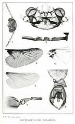 | Keywords: DeuterophlebiaMirabilisPhoto.jpg Deuterophlebia mirabilis Fig 1 Head and bases of antennae x30 balsam mount Fig 2 Head from beneath showing mouth opening x80 Fig 3 Base of flagellum of antennae showing enlargements on first three segments Fig 4 Wing mounted dry x 5 Showing the arrangement of folds Costa slightly folded under towards base Fig 5 Wing mounted in balsam x9 Showing traces of true venation the apparent distinction of Sc and R is partly due to this region not being quite flat Fig 6 Base of wing x30 Showing sclerites of attachment Fig 7 Tip of tarsus x180 Showing claw and empodium Fig 8 Tip of abdomen http //www archive org/stream/s7annalsmagazine09londuoft page/n410/mode/1up Annals and Magazine of Natural History 9th Series Number 52 1922 F W Edwards 1888-1940 pd-old-70 Deuterophlebiidae |