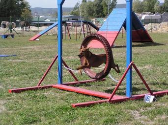 Keywords: Deutscher Pinscher jumping through a tire.jpg Circle photo by Martina Vakoničová www agility-skiper sk 2004-09-11 own assumed Prskavka~commonswiki Tire jump Deutscher Pinscher