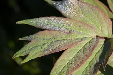 Keywords: dew dewdrop morgentau drip drop of water leaf nature close green morning light peony spring