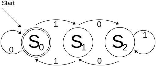 | Keywords: DFA example multiplies of 3.svg Example of a DFA that accepts binary numbers that are multiplies of 3 Příklad deterministického konečného automatu který přijímá binární čísla která jsou beze zbytku dělitelná třemi own 2007-03-20 Self-made Original PNG Transition monoid wikitable - 808080 <br>012 808080 0 <br>021 808080 1 <br>102 808080 10 <br>120 808080 01 <br>201 808080 010 <br>210 - 808080 <br>012 808080 <br>012 808080 0 <br>021 808080 1 <br>102 808080 10 <br>120 808080 01 <br>201 808080 010 <br>210 - 808080 0 <br>021 808080 0 <br>021 808080 <br>012 808080 01 <br>201 808080 010 <br>210 808080 1 <br>102 808080 10 <br>120 - 808080 1 <br>102 808080 1 <br>102 808080 10 <br>120 808080 <br>012 808080 0 <br>021 808080 010 <br>210 808080 01 <br>201 - 808080 10 <br>120 808080 10 <br>120 808080 1 <br>102 808080 010 <br>210 808080 01 <br>201 808080 <br>012 808080 0 <br>021 - 808080 01 <br>201 808080 01 <br>201 808080 010 <br>210 808080 0 <br>021 808080 <br>012 808080 10 <br>120 808080 1 <br>102 - 808080 010 <br>210 808080 010 <br>210 808080 01 <br>201 808080 10 <br>120 808080 1 <br>102 808080 0 <br>021 808080 <br>012 Numeric entries denote functions mapping a state to a state; e g 102 abbreviates the function mapping state 0 1 and 2 to state 1 0 and 2 respectively; this is the function for digesting an input 808080 1 The table shows the result of function composition e g 021 102 201 and 102 021 120 808080 Grey entries give a shortest input string corresponding to a function cob Equivalent alternate representations - colspan 5 Regular grammar - colspan 5 Start symbol S<sub>0</sub> - S<sub>0</sub> ε 0 S<sub>0</sub> 1 S<sub>1</sub> - S<sub>1</sub> 0 S<sub>2</sub> 1 S<sub>0</sub> - S<sub>2</sub> 0 S<sub>1</sub> 1 S<sub>2</sub> Regular expression <source lang pcre enclose none > 0 1 01 00 0 1 </source> cob Deterministic finite state automata |