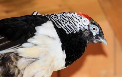 Keywords: diamond pheasant pheasant bird amherst chrysolophus amherstiae black and white animal feather animal world bill still curious wait fluffed up enclosure smooth foot chicken red head striped yellow spot eye pointed