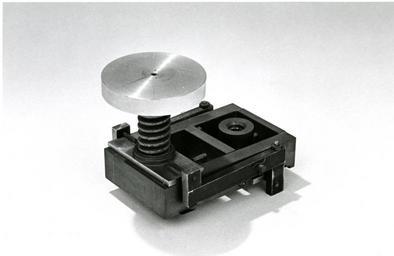 | Keywords: DiamondAnvilCell 003.jpg This device enables scientists to study the effects of pressure on molecular interactions through infrared spectroscopy by permitting application of very high pressures to a specimen squeezed between Diamond Anvils Instruments like this one which was designed at NBS around 1960 are now used in many laboratories throughout the world for spectroscopy microscopy and x-ray diffraction In order to study the effects of very high pressure on molecular interactions finely powdered material is squeezed to a film between the flat surfaces of two gem-cut diamonds The facets which form the anvil have an area of about 0 1 mm and the diamonds are of Type II which is transparent to infrared radiation between 1750 -1 and 300 -1 Each diamond is mounted in a close-fitting recess in a piston of 1 cm diameter and having an axial hole which permits passage of the radiation beam The anvil faces can be adjusted to parallelism by means of a set of tiny leveling screws The entire assembly is sufficiently compact to be held on the stage of a microscope or placed in an infrared spectrometer or an x-ray diffractometer Anvil pressures up to 20 gigapascals 200 kilobars can be developed the force being applied to the anvil facets through the mounting pistons by compression of the helical spring acting through the 2 1 level system National Institute of Standards and Technology 1998-01-01 National Institute of Standards and Technology The images in the Diamond Anvil Cell Photographic Collection are in the public domain and are not subject to copyright in the United States However please pay special attention to the individual works to make sure there are no copyright restrictions indicated Individual works may require securing other permissions from the original copyright holder Use of the images from NIST Digital Collections is not restricted but a statement of attribution is required Please use the following attribution statement National Institute of Standards and Technology Digital Collections Gaithersburg MD 20899 PD-USGov National Bureau of Standards National Institute of Standards and Technology Diamond anvil cell |