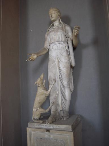 | Keywords: Diana, Vatican.JPG Artwork Roman The history of the statue is interesting Although her body appears to be female it is a fifth century BC Greek statue of the god Apollo with the head of a second century Roman Diana She is identified as the goddess of the moon because of the lunar crescent on her forehead and of the hunt as shown by the Greyhound and the quiver at her side which were carved and attached in the late 18th century by a local sculptor marble Roman Museum musei Vaticani Galleria del Candelabri PD-old-100 Photo Henry Townsend Galleria dei Candelabri Vatican Diana Sculptures of women Statues of Diana Females with weapons in art Greyhounds in art in antiquity Diana with greyhounds Sculptures of greyhounds Ancient Roman statues in the Vatican Museums Diana Statues of animals in Rome dogs |