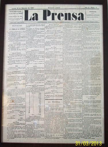 Keywords: Diario La Prensa, Buenos Aires, Argentina, primer ejemplar.JPG en Copy of La Prensa Argentine newspaper 1 es Primer ejemplar del diario La Prensa Buenos Aires Argentina 1869-10-31 Own scan La Prensa PD-AR-Anonymous PD-1923 watermark La Prensa Argentina 1869 in Argentina |