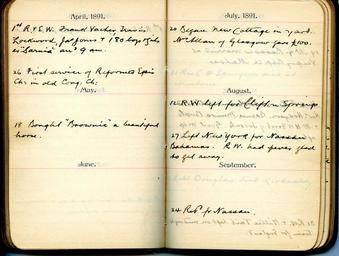 | Keywords: 1880s 1890s 1900s 1910s 1920s diaries home children homechildren April 1891 Apr. 1st, R &E W, Frank Vacher, Travis Lockwood, Jas Jones & 180 boys & girls ex "Sarnia" arrived 9 am Apr. 16, First service of Reformed Episcopal Church in old Congregational Church Apr. 18, Bought "Brownie", a beautiful horse. July 1891 Began new cottage in yard. Mrs. Allan of Glasgow gave 100 pounds August 1891 12th, R W left for Clifton Springs 27th, Left New York for Nassau Bahamas. R W had fever so glad to get away September 1891 Sept. 24th, Returned from Nassau April 1891 Apr. 1st, R &E W, Frank Vacher, Travis Lockwood, Jas Jones & 180 boys & girls ex "Sarnia" arrived 9 am Apr. 16, First service of Reformed Episcopal Church in old Congregational Church Apr. 18, Bought "Brownie", a beautiful horse. July 1891 Began new cottage in yard. Mrs. Allan of Glasgow gave 100 pounds August 1891 12th, R W left for Clifton Springs 27th, Left New York for Nassau Bahamas. R W had fever so glad to get away September 1891 Sept. 24th, Returned from Nassau |